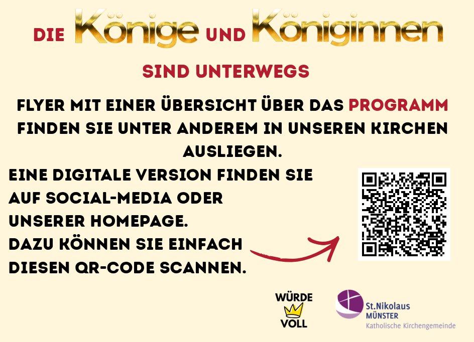 Ab dem 18.02.2026 haben wir besondere Gäste bei uns: 13 Königinnen und Könige von Ralf Knoblauch. Er ist Diakon und Pastoralreferent in Bonn. Jeden Morgen schenkt er dem Thema „Würde – Menschenwürde“ eine Stunde, in der er eine Figur mit goldener Krone schnitzt.  Um das Thema wach zu halten, die Menschen aufzuwecken und aufzurütteln, schickt er die Königsfiguren in die Welt.