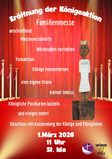 Der Einzug aller Königinnen und Könige ist in der Familienmesse am Sonntag, 01.03., um 11 Uhr in der St.- Ida-Kirche. Anschließend laden wir zum Beisammensein im Pfarrheim St. Ida ein. Es wird einen Imbiss geben und unterschiedliche Möglichkeiten, sich mit den Königsfiguren zu beschäftigen: kreative Angebote, Gespräche, Begegnungen.
