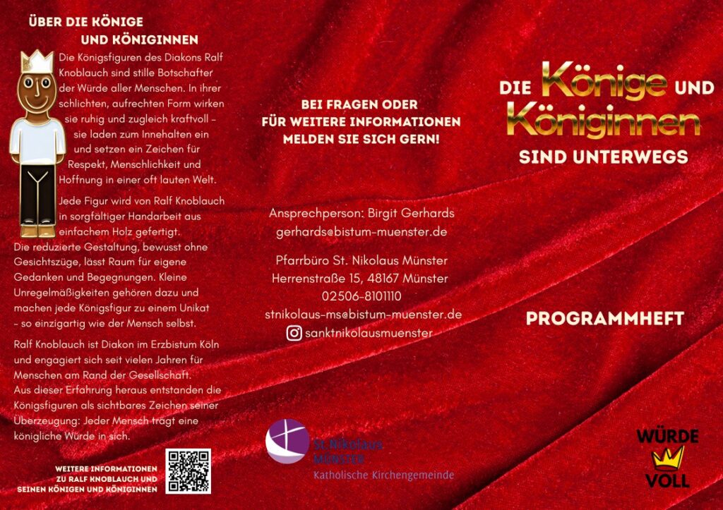 Die Königinnen und Könige sind keine stillen Ausstellungsstücke. Sie stehen an verschiedenen Orten innerhalb der Pfarrei, wandern durch Gruppen, tauchen überraschend im Alltag auf und treten auf leise Weise in Beziehung zu den Menschen. Sie eröffnen Räume für Begegnung, Nachdenken und Gespräch – über Würde und darüber, was uns im Innersten ausmacht.