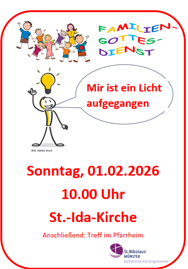 Familienmesse am So., 1. Feb. um 10:00 Uhr in der St.-Ida-Kirche. Herzliche Einladung.